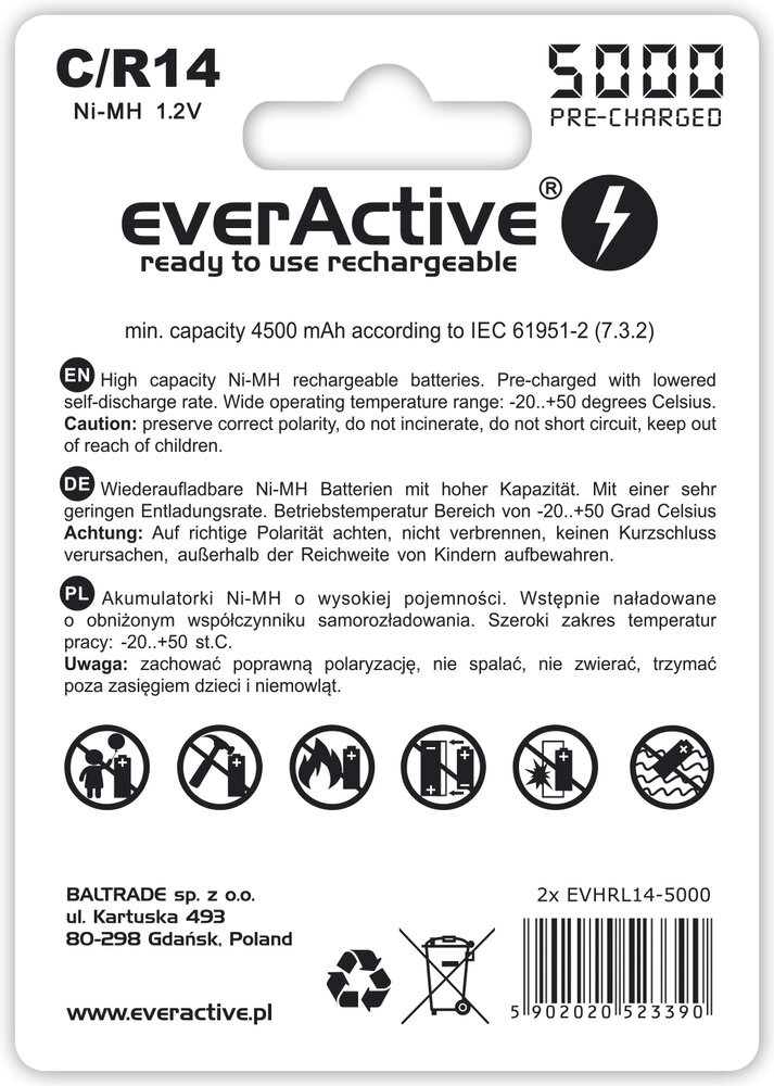 Ti akumulatorji znamke EverActive so odlični za uporabo v svetilkah, igračah in drugih napravah. Zahvaljujoč tehnologiji »ready to use« jih je mogoče uporabiti kot neposredno zamenjavo za alkalne baterije.