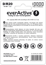 Akumulatorji everActive R20/D 10000 mAh so idealni za profesionalno uporabo. Zahvaljujoč tehnologiji »pripravljeni za uporabo« so odlična zamenjava za alkalne baterije in so primerni za naprave, kot so svetilke in igrače.