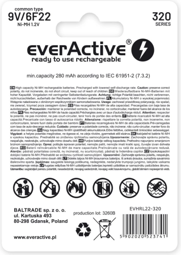 Akumulator everActive 9V 320 mAh Ni-MH je idealna izbira za profesionalno uporabo. S tehnologijo »pripravljen za uporabo« je odlična zamenjava za alkalne baterije.