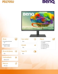 Odkrijte podrobno sliko in verne barve na 27" IPS panelu z 4K ločljivostjo, ki je idealen za grafično oblikovanje, obdelavo fotografij in video. Monitor BENQ PD2705U prinaša dosledno prikazovanje po celotni površini in stabilne kote gledanja. Zahvaljujoč hitremu odzivnemu času 5 ms in kakovostni osvetlitvi ozadja je slika tekoča in čista.