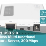 Z večvratnim brezžičnim USB strežnikom 2.0 znamke DIGITUS lahko USB naprave preprosto upravljate prek omrežja brez potrebe po povezavi s PC-jem ali prenosnikom. Strežnik zagotavlja hitrost do 300 Mb/s in omogoča brezžično povezavo vseh USB naprav v omrežju.