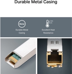 SFP modul 1000BASE-T RJ45 TP-LINK je idealna izbira za razširitev gigabitne povezljivosti po obstoječi bakreni napeljavi. Omogoča prenos podatkov do 100 metrov med vmesnikom SFP in gigabitnimi vrati RJ45, zasnova plug and play pa omogoča hitro uvedbo – brez zapletene konfiguracije.
