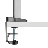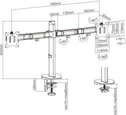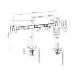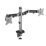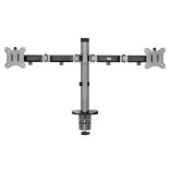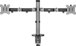 Univerzalni vrtljivi nosilec za dva monitorja velikosti 17–32" in teže do 9 kg na vsak monitor. Montaža na rob mize ali v kabelsko odprtino, združljivost VESA 75x75 in 100x100. Ponuja popolno ergonomsko nastavljivost – višina, nagib in vrtenje – za največje udobje in prihranek prostora na delovni mizi.