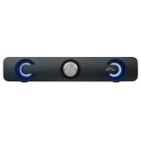 Ima osrednje nameščen srebrn gumb za upravljanje, ki služi kot regulator glasnosti in stikalo. Impresiven moder osvetljen dizajn zvočnikov dodaja moderen videz, vse to pod znamko Media-Tech.