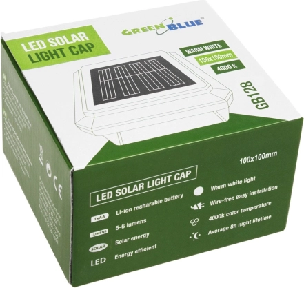 Ta sončna končna kapa za steber je idealna za dekorativno in praktično osvetlitev stebrov ograj in teras. Podnevi se polni s soncem, po mraku pa se samodejno prižge, da osvetli poti, stopnice in vhode. Daljša izpostavljenost neposrednemu soncu zagotavlja daljšo nočno avtonomijo.