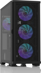 Ohišje je optimizirano za maksimalen pretok zraka – mrežasti paneli in premišljeno prezračevanje pospešijo odvajanje toplote iz komponent. Podpora za adresabilno RGB sinhronizacijo in priložen ARGB razdelilec 1‑na‑2 poenostavita napeljavo kablov in razširitev osvetlitve.