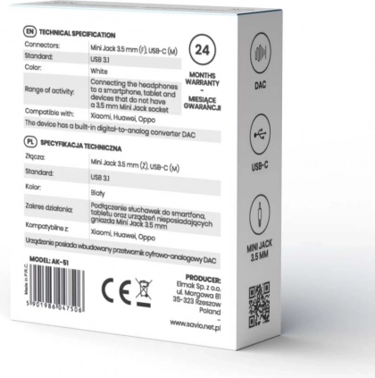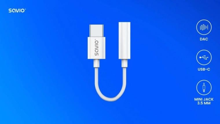 Kompakten adapter USB‑C na 3,5 mm podjetja SAVIO omogoča priklop klasičnih slušalk in zvočnikov na sodobne telefone, tablice in prenosnike brez avdio priključka. Zahvaljujoč vgrajenemu pretvorniku DAC ponuja čist in kakovosten zvok, je združljiv z USB‑C napravami in je idealen za XIAOMI, HUAWEI in OPPO.