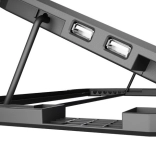 Za udobno uporabo podloga ponuja 7 stopenj nastavitve nagiba, zato zlahka najdete idealen položaj za tipkanje in ogled vsebin. Stabilnost na katerikoli podlagi zagotavljajo protizdrsni elementi. Napajanje je preprosto prek USB – v paketu najdete USB kabel in USB‑C → USB‑A adapter, zato podlogo zlahka povežete z modernimi prenosniki brez zunanjega napajanja.