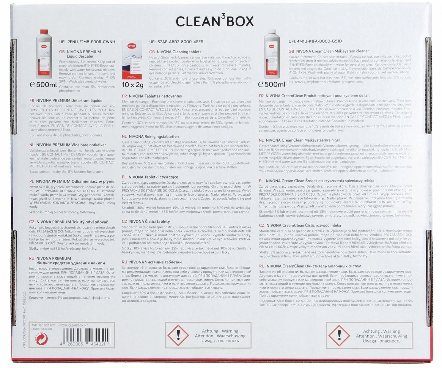 Komplet Clean3Box je idealna rešitev za ohranjanje vašega kavnega aparata NIVONA v popolni kondiciji. Ta set ponuja: