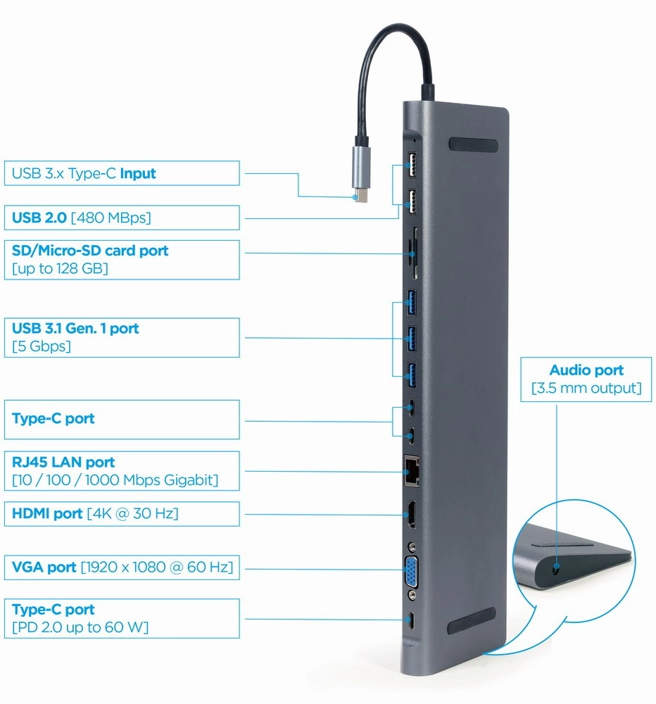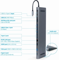 Kompakten večportni USB‑C hub 9v1 v elegantnem kovinskem ohišju združi vse vaše povezave v eni napravi. Ponuja HDMI 4K@30 Hz, VGA Full HD, gigabitni LAN, 3x USB 3.1 Gen 1 (5 Gb/s), 2x USB 2.0, USB‑C Power Delivery 60 W, čitalnik SD/microSD in 3,5-mm avdio. Enostaven Plug & Play brez gonilnikov.