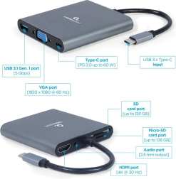 - 6 v 1: HDMI 4K, VGA FHD, USB 3.0, avdio 3,5 mm, SD in microSD, USB‑C PD