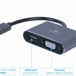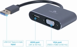 Univerzalni video adapter za enostavno priklopitev računalnika na monitor ali televizor prek HDMI ali VGA (D‑Sub). Podpira 4K pri 30 Hz na HDMI in Full HD 1080p pri 60 Hz na VGA, omogoča zrcaljenje in razširitev zaslona, ne zahteva zunanjega napajanja ter nudi hitro namestitev zahvaljujoč vgrajenim gonilnikom.