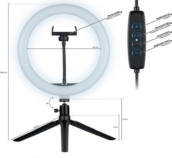 Upravljanje je hitro in intuitivno zahvaljujoč osvetljenemu upravljalniku na USB kablu, kjer lahko luč vklopite/izklopite ter spreminjate svetlost in barvo. Držalo za telefon namestite neposredno v sredino obroča za enakomerno osvetlitev obraza. Mini namizno stojalo z vrtljivo in nastavljivo glavo omogoča natančno nastavitev kota posnetka.