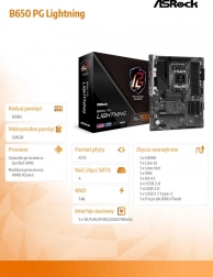 ASRock B650 PG Lightning je zanesljiva osnova za zmogljiv PC. Platforma AM5 s podporo za procesorje AMD Ryzen 7000 in štiri reže DDR5 omogoča sestavo hitrega in učinkovitega sistema. Kakovostna napajalna zasnova 14+2+1 s Smart Power Stage in masivnimi hladilniki zagotavlja stabilnost tudi pri dolgotrajni obremenitvi.