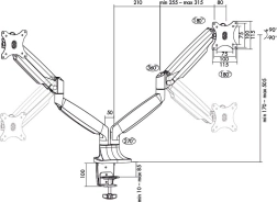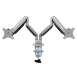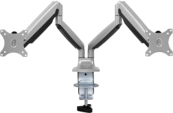 Dvojna roka za monitorje omogoča prilagajanje višine, naklona in zasuka obeh zaslonov, da dosežete idealen kot gledanja. Robusten dizajn zagotavlja stabilnost, medtem ko namizna objemka prihrani dragocen prostor na delovni površini.