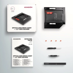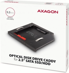 Okvir AXAGON RSS-CD09 je namenjen za vgradnjo namesto CD/DVD pogona višine 9,5 mm in podpira SATA diske 2.5" SSD/HDD. Zahvaljujoč združljivosti s SATA 6G ponuja izkoriščanje sodobnih hitrosti do 6 Gb/s brez izgube funkcionalnosti, kot je TRIM. Okvir je opremljen z dvojnim stikalom, ki zagotavlja široko združljivost s prenosniki, kot so LENOVO, HP, DELL in drugi.