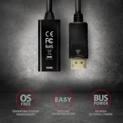 Adapter DisplayPort na HDMI AXAGON omogoča preprosto priključitev TV-ja, monitorja ali projektorja na računalnik z izhodom DisplayPort. Podpira ločljivosti do 4K/30Hz in zagotavlja kakovosten prenos slike in zvoka.