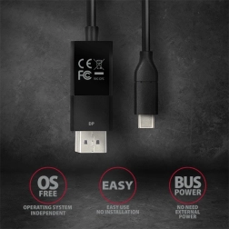 Praktični aktivni kabel združuje pretvornik in povezovalni vodnik v eno kompaktno rešitev. Omogoča prikaz vsebine z USB‑C naprave na zaslonu z DisplayPortom v vrhunski kakovosti Ultra HD 4K pri 60 Hz, vključno z večkanalnim zvokom. Konektor DP ima zaponko z gumbom za sprostitev za trdno in varno povezavo, napajanje poteka neposredno iz USB‑C – brez zunanjega adapterja.