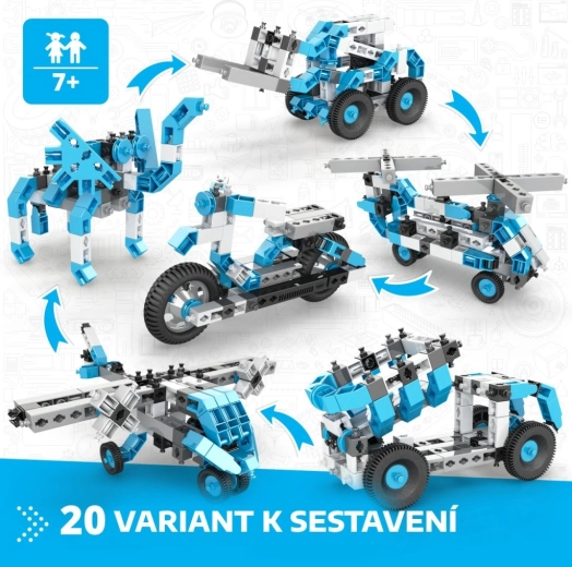Konstrukcijski set Engino Box 20 modelov prinaša otrokom od 7 let ure zabavnega odkrivanja principov konstrukcije in inženirstva. Iz enega seta boste zgradili avtomobile, motorje, letala, helikopterje, robote in živali – vse z realističnimi detajli in funkcijami za domiselno igro. Deli so trdni, lahki in zasnovani za udobno sestavljanje.