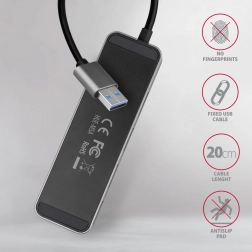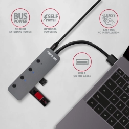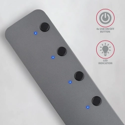 AXAGON HUE-MSA je robusten in eleganten USB hub iz aluminija, ki ponuja štiri vrata USB-A s hitrosti USB 3.2 Gen 1 do 5 Gb/s. Zahvaljujoč posameznim stikalom z LED indikatorjem zlahka izključite nepotrebne naprave brez izpaha konektorjev. Vgrajeni micro USB za dodatno napajanje poveča stabilnost pri uporabi več zunanjih diskov.