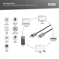 Ta kakovosten kabel DP–HDMI omogoča preprosto priključitev PC-ja ali prenosnika z DisplayPortom na televizor, monitor ali projektor z HDMI. Deluje brez zunanjega napajanja, nudi gladek prikaz v 4K pri 30 Hz in je idealen za delo, multimedijo in igranje.
