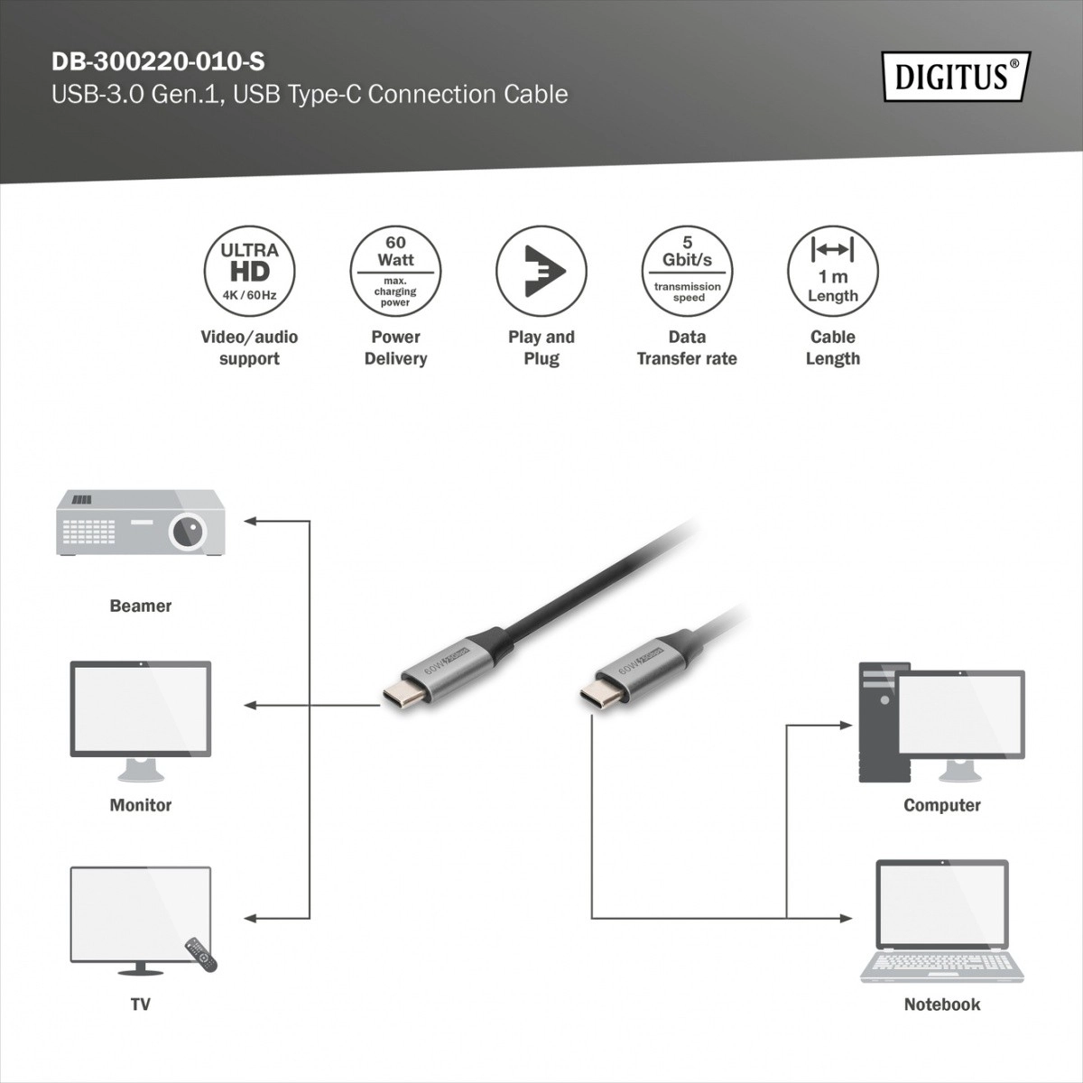Zanesljiv USB‑C/USB‑C kabel z aluminijasto izvedbo je idealen za polnjenje, sinhronizacijo podatkov ter prenos slike in zvoka. Zahvaljujoč podpori USB Power Delivery 60 W hitro napolni prenosnike, tablice in telefone, medtem ko vmesnik USB 3.0 (5 Gbps) zagotavlja hitro kopiranje velikih datotek.