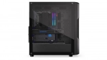 Zaradi radodarnega prostora boste zlahka namestili E‑ATX osnovno ploščo, grafično kartico do 360 mm in napajalnik do 275 mm. Za shrambo imate prilagodljive možnosti: 2× 3.5" + 2× 2.5" ali 4× 2.5". Stranski panel iz kaljenega stekla elegantno pokaže RGB elemente in čisto vodenje kablov.