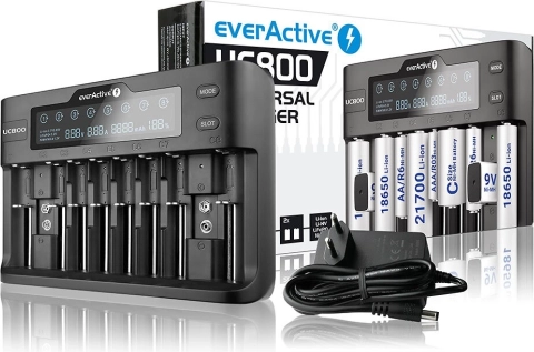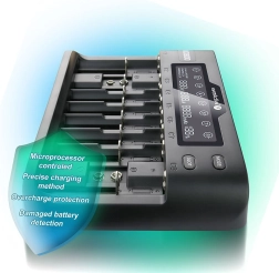 Univerzalni polnilec z največjo združljivostjo: polni Ni-MH (AA, AAA, C, SC, 9V) ter Li-ion 3,6/3,7 V, Li-HV 3,85 V in LiFePO4. Podpira formate od 10440 do 26650, vključno z 20700/21700 z zaščito, in zahvaljujoč drsnim ležiščem z dolžino do 76 mm obvlada tudi daljše celice.