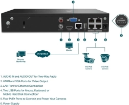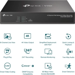 VIGI NVR1004H-4P je kompaktni NVR za 4 IP kamere, ki združuje visoko kakovost slike in preprosto uvedbo. Zahvaljujoč 4K HDMI izhodu in dekodiranju do 16 MP dobite oster pregled iz več kotov. Vgrajena vrata PoE+ napajajo in povežejo kamere z enim kablom, kar pospeši namestitev in zniža stroške.