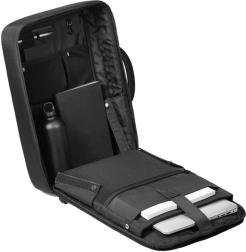 Nahrbtnik ima žepe za mestno kartico ali dokumente v naramnicah, ergonomsko penasto oblazinjenje EVA pa nudi udobje. Glavni predal se odpre pod kotom 180° in vsebuje organizacijsko ploščo ter odsevne elemente za boljšo vidnost. Predal za prenosnik je do 16" in za tablico do 12,9".
