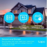 Namestite jo lahko z možnostmi montaže na steno, strop ali drog. Videoposnetke je mogoče shranjevati na kartico microSD s kapaciteto do 512 GB ali v oblak Tapo Care. Kamera podpira dvosmerni zvok za enostavno komunikacijo in ima fizični način zasebnosti za prekrivanje objektiva.