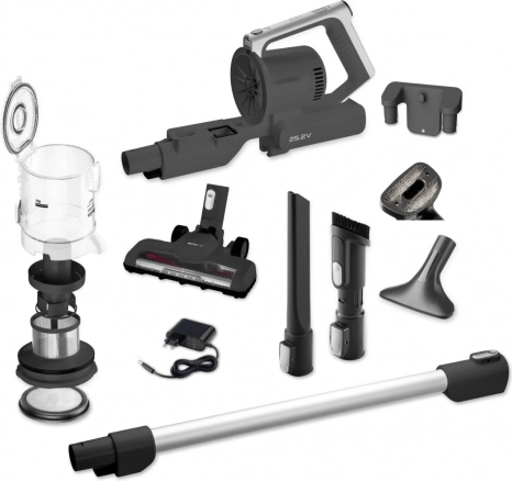 V kompletu so posebna PET šoba za živalsko dlako, šoba za SOFA (oblazinjenje), ožja šoba in nastavki za prah ter nastavek za knjige in občutljive površine. Stenski nosilec olajša shranjevanje sesalnika in dodatkov, medtem ko zaščita baterije pred pregrevanjem in predmotorni filter podaljšujeta življenjsko dobo naprave.