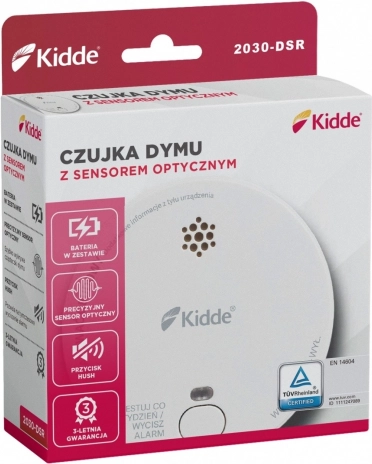 Optična tipala so občutljiva na viden dim in zagotavljajo odlično zaščito predvsem pri počasnem tlenju materialov. Model KIDDE 2030-DSR združuje preprosto montažo na baterijo z visoko zanesljivostjo in elegantnim videzom, ki ne kazi interierja. Funkcija TEST & HUSH omogoča hitro preverjanje stanja in začasno utišanje pomotoma sproženega alarma.