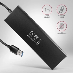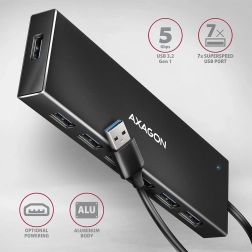 AXAGON HUE-F7A je eleganten aluminijast razdelilnik, ki zagotavlja visoko mehansko odpornost in preprečuje sledi prstov. Razdelilnik ponuja en ločen USB-A priključek spredaj za enostavno povezavo večjih naprav.