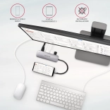 Ta hub ponuja tri USB porte s standardnimi USB‑A konektorji. Omogoča stalno podporo več zunanjim diskom. Zahvaljujoč hitremu vmesniku USB 3.2 Gen 1 je prenos podatkov podprt s hitrostjo do 5 Gb/s. Hub omogoča tudi polnjenje telefonov in tablic s tokom do 1.5 A / 5 V.