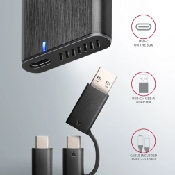 Ohišje AXAGON je opremljeno z modernim priključkom USB‑C za zanesljivo povezavo in je priložen kabel USB‑C -> USB‑C ter adapter USB‑C -> USB‑A. Tako ga lahko preprosto priključite na prenosnik, računalnik ali celo na mobilno napravo.