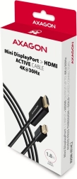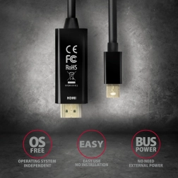 Aktivni kabel AXAGON Mini DisplayPort → HDMI združuje pretvornik in povezovalni kabel v eno rešitev. Dovolj je priklopiti in takoj prenašati sliko ter zvok na HDMI naprave. Podpira ločljivosti do 4096 × 2160 pri 30 Hz, kar zagotavlja ostro sliko in tekoče predstavitve ali video v 4K.