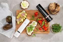 Zmogljiv motor, ki ga napaja polnilna litij‑ionska baterija, zagotavlja stabilno moč in dolgo avtonomijo med polnjenji. Vgrajena LED osvetlitev osvetli pripravljeno jed, medtem ko pregledno okence omogoča preprost nadzor zaloge. Minimalističen dizajn dvojca Matteo Thun & Antonio Rodriguez se odlično poda sodobnim kuhinjam.