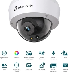 Profesionalna kupolna IP kamera VIGI C240 z ločljivostjo 4MP prinaša polnobarvno sliko 24/7, napredno AI zaznavo oseb in vozil, vgrajen mikrofon ter odpornosti IK10 in IP67. Podpira H.265+, napajanje PoE/12V DC, lokalni zapis na microSD (do 256 GB) in prilagodljivo upravljanje prek spleta, NVR in aplikacije VIGI.