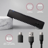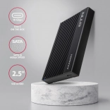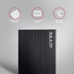Uporaba rebrastega aluminijastega ohišja prispeva k učinkovitemu hlajenju in zaščiti diska, medtem ko gumijaste nogice zagotavljajo stabilnost na površini. Eleganten dizajn preprečuje nezaželene prstne odtise.