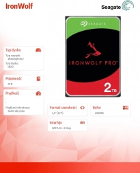 Za dolgotrajne obremenitve disk ponuja delovno obremenitev 180 TB/leto, MTBF 1 milijon ur in je zasnovan za neprekinjen dostop do podatkov 24/7. Vgrajeni RV senzorji zmanjšujejo vibracije v večležiščnih NAS napravah, medtem ko IronWolf Health Management pomaga pri preventivi, intervenciji in obnovi. Vključen je tudi 3-letni Rescue Data Recovery z visoko uspešnostjo reševanja podatkov.