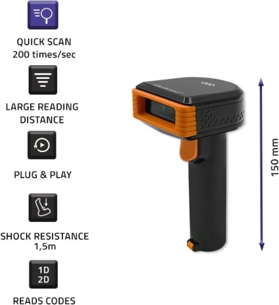 Pospešite delo na blagajni, v skladišču in pri odpošiljanju. Čitalnik Qoltec zanesljivo bere 1D in 2D kode z visoko hitrostjo do 200 skenov/s, obvlada skeniranje pod različnimi koti in zahvaljujoč avtomatskemu načinu začne zajem ob približanju kodi. Vzdržljiva konstrukcija iz ABS materiala prenese padce do 1,5 m, zato je pripravljen za zahtevno uporabo.
