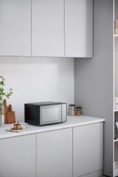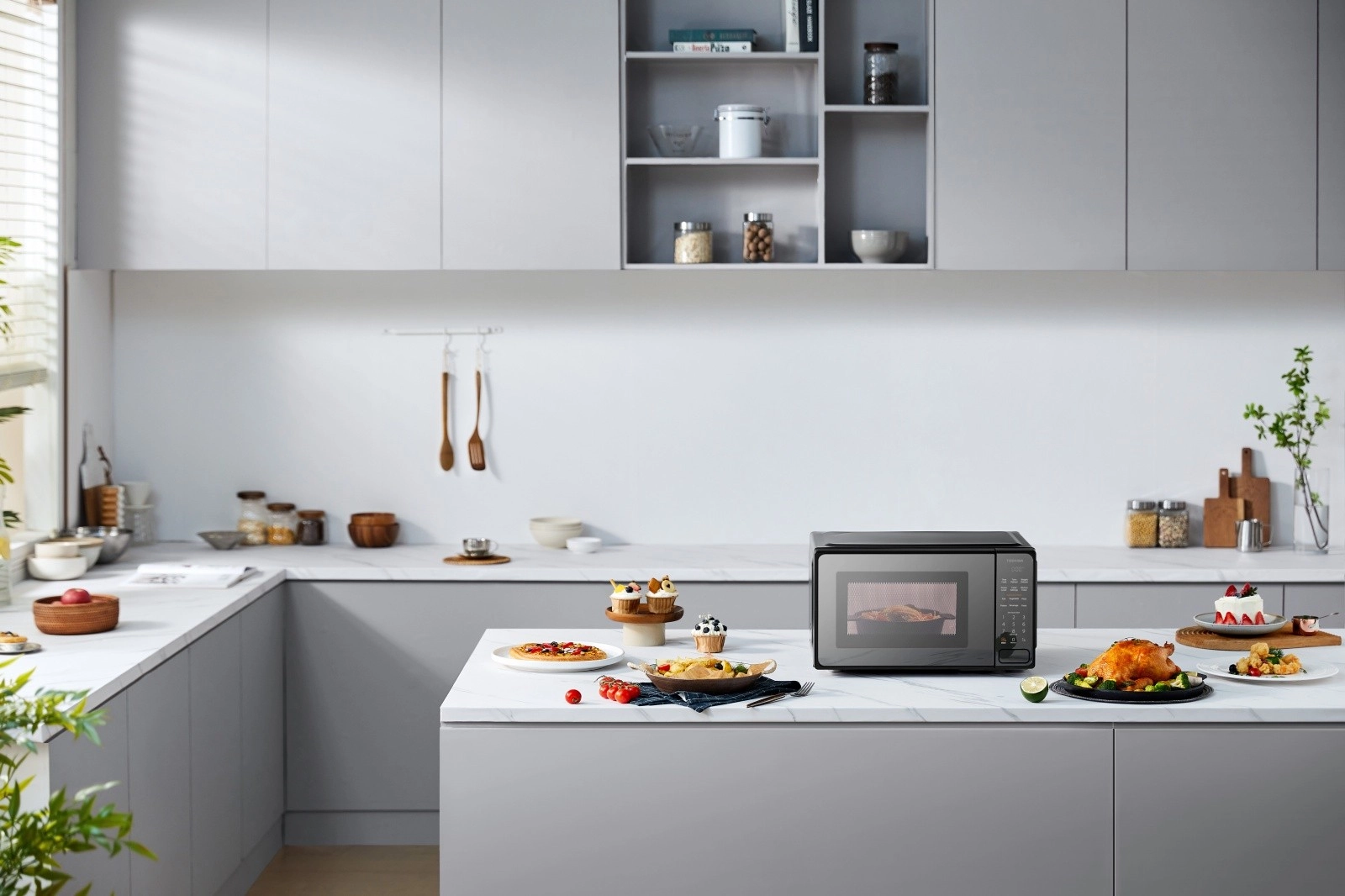 Mikrovalovna pečica je kompaktna in se prilega različnim kuhinjam.