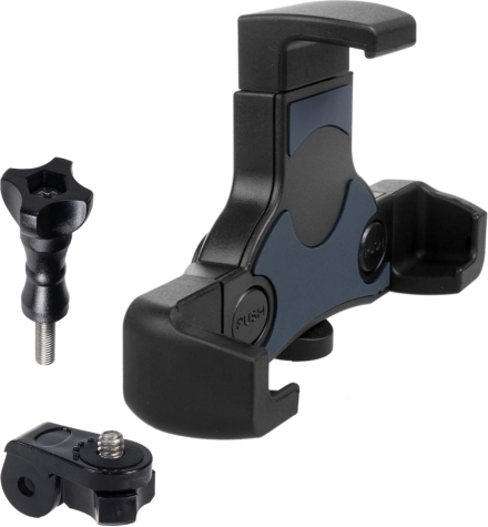 Sestavni del je adapter GoPro → 1/4" za priklop večine akcijskih kamer in fotoaparatov s standardnim stativnim navojem. Kovinski montažni vijak in trpežne plastične komponente zagotavljajo čvrstost in dolgo življenjsko dobo. Nosilec za telefon stabilizira sliko, zato lahko snemate ostre videe tudi v zahtevnih razmerah.
