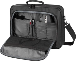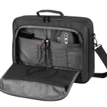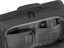 Sprednji žep ponuja prostor za dodatne pripomočke, kot so miške in diski, in poseben organizator drži vse na svojem mestu. Odkrijte prostor za kable in napajalni vir.