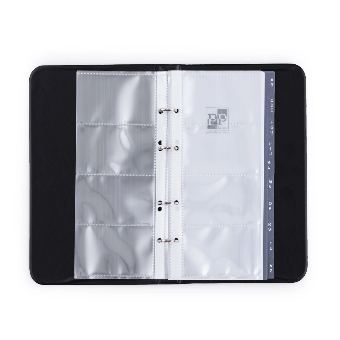 Imejte svoje poslovne stike popolnoma urejene. Ta vizitkar z obročnim mehanizmom omogoča enostavno menjavo in dopolnjevanje listov, pri čemer sprejme do 80 standardnih vizitk. Črn sijoč videz zagotavlja profesionalen izgled in je odporen na običajno obrabo.