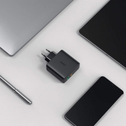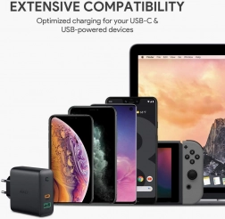 Polnite svoje naprave hitro in učinkovito s polnilcem AUKEY PA-D3. Dva priključka – USB-C Power Delivery in USB-A – pokrivata vse od telefonov in slušalk do zmogljivejših naprav, vključno s prenosniki in monitorji, napajanimi prek USB-C. Tehnologija Dynamic Detect inteligentno dodeli moč: pri eni priključeni napravi do 60 W, pri dveh napravah optimizira razporeditev (npr. do 45 W za primarni priključek) ter tako zagotavlja hitro in varno polnjenje.