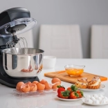 Ta kuhinjski robot prinaša komplet različnih nastavkov: kavelj za testo, ploščat mešalnik in žični mešalnik. Ti nastavki omogočajo tako mešanje kot stepanje in gnetenje.