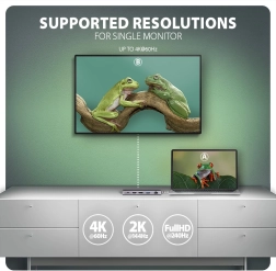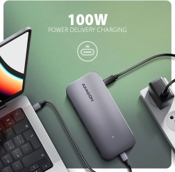 Ustvarite si kompaktno delovno postajo z enim kablom. Hub ponuja 3× USB-A (2× 5 Gb/s, 1× 10 Gb/s) in 1× USB-C 10 Gb/s za hitre periferije in zunanje diske. Sliko priključite preko HDMI in DisplayPort do 4K/60 Hz – posamezno ali hkrati, z vključeno podporo HDR in visokih igralnih frekvenc (2K/144 Hz, Full HD/240 Hz). Poseben priključek USB-C PD 100 W s prehodnim napajanjem prihrani priključek v vašem prenosniku.