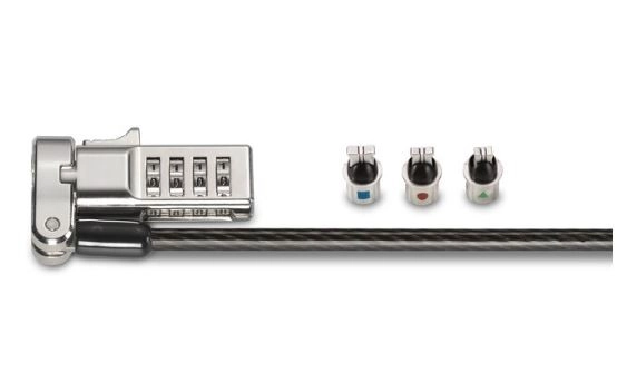 - Ena ključavnica za katero koli režo ustreza standardnim, nano ali klinastim varnostnim režam za prenosnike ne glede na znamko ali generacijo, kar pomaga zagotoviti prihodnjo združljivost vaše rešitve zaklepanja. Zaklepne nastavke je mogoče preprosto zamenjati; zanka ohranja neuporabljene nastavke pri roki.